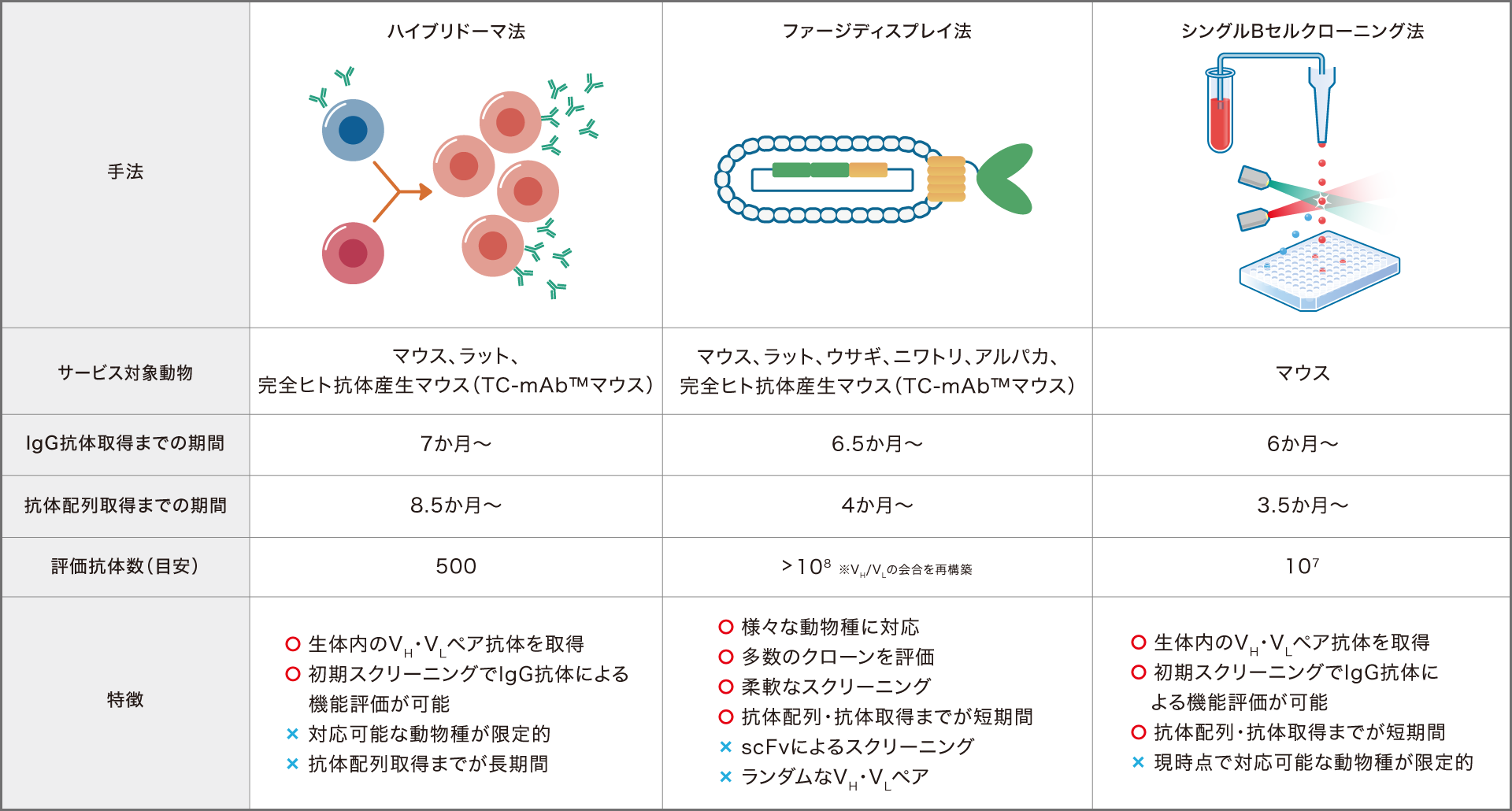 抗体の取得方法はハイブリドーマ法とファージディスプレイ法およびシングルBセルクローニング法の3種類をご提供していますが、抗体取得後のリード最適化における遺伝子改変プロセスへのスムーズな移行のため、抗体のスクリーニングと同時に抗体遺伝子を取得できるファージディスプレイ法による抗体取得をお勧めしております。
