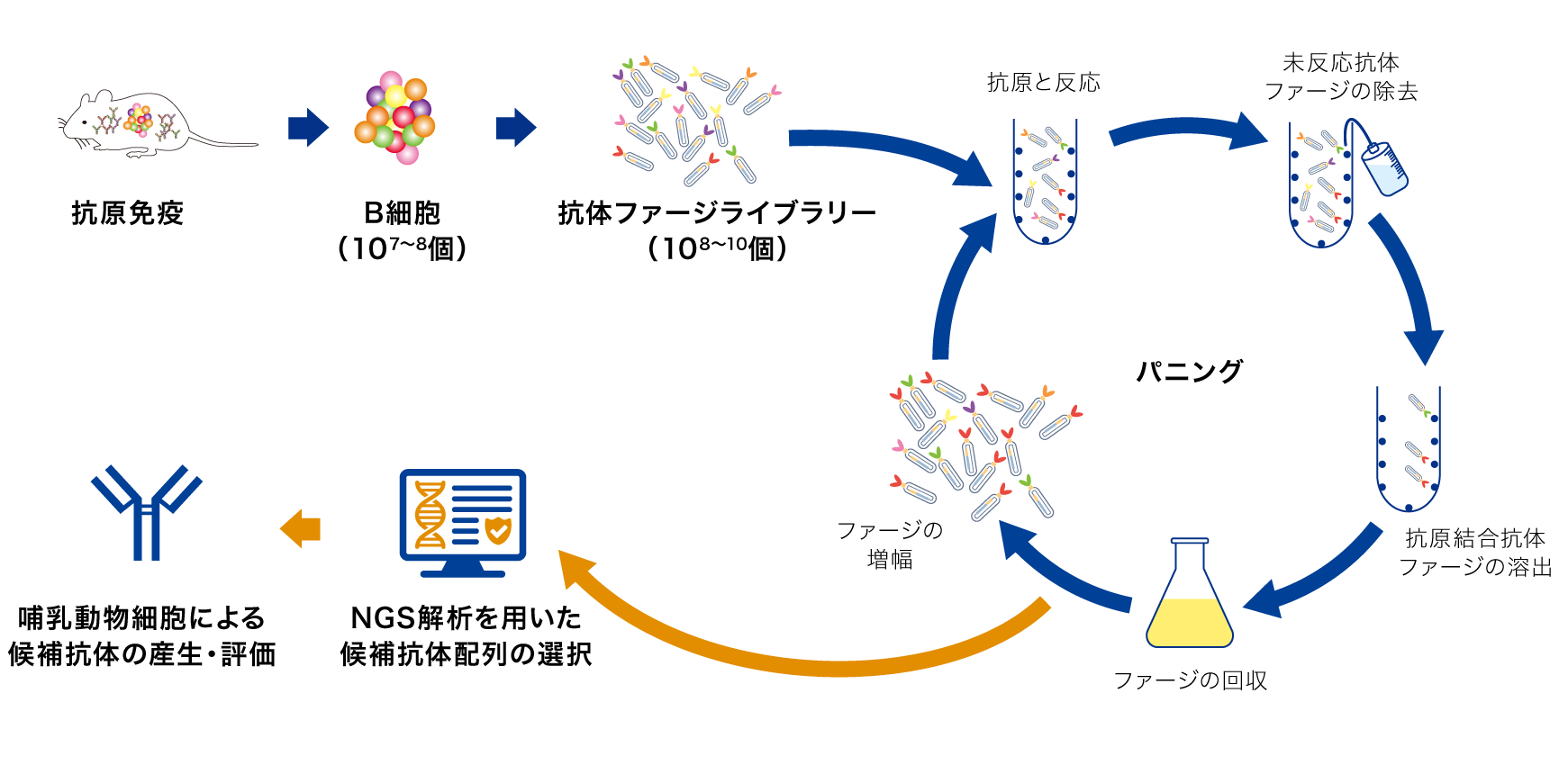 当社のファージディスプレイ法では、次世代シークエンス(NGS:Next Generation Sequencing)解析を組み合わせた、抗原特異的な抗体の取得サービスを提供しています。はじめに、免疫動物から取得したB細胞から抗体ファージライブラリーを作製します。この抗体ファージライブラリーから標的抗原を用いてスクリーニングを行い、抗原特異的な抗体群の遺伝子を取得します。取得した抗体遺伝子のNGS解析を行い、MBL独自のアルゴリズムにより、候補となる抗体クローンを選択します。更に、選択した抗体配列をもとに、候補抗体を発現し、評価することも可能です。