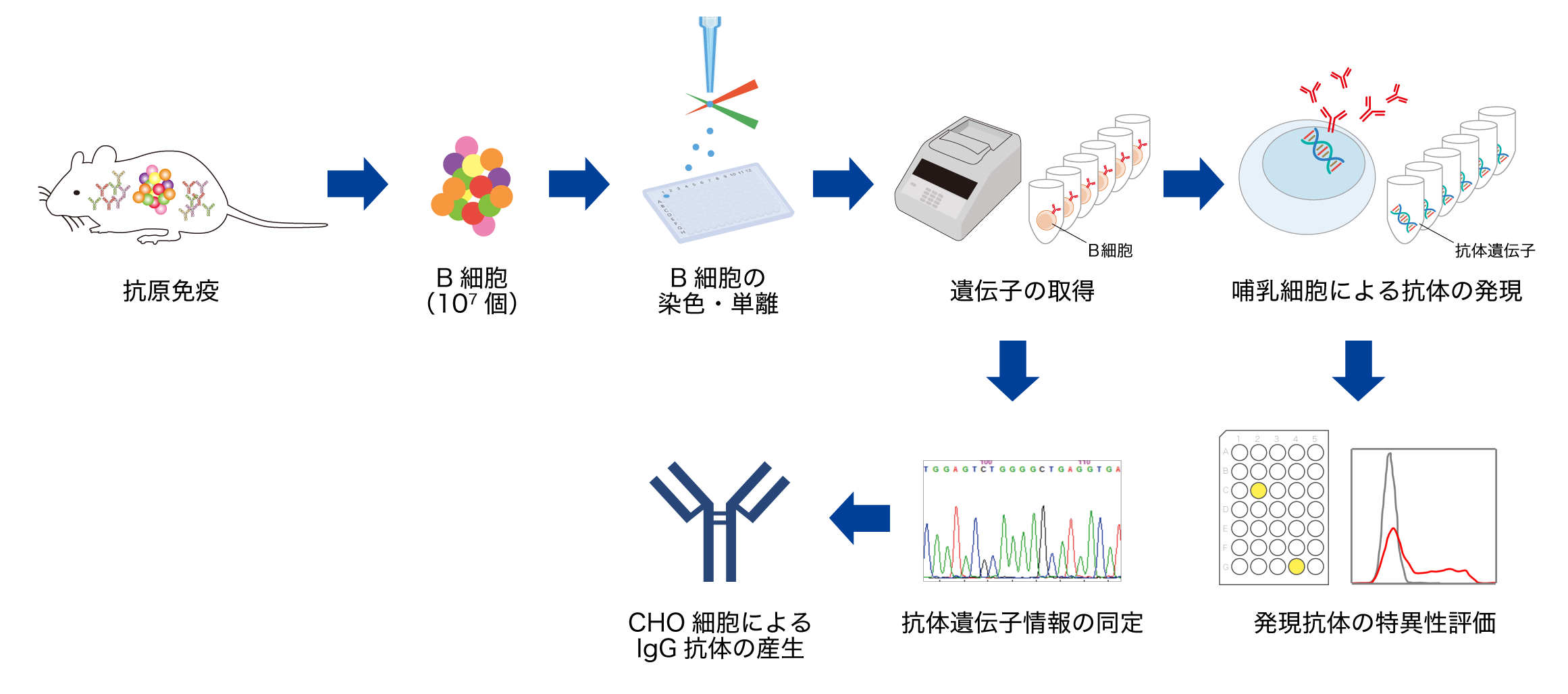 当社のシングルBセルクローニング法では、免疫マウスから取得した免疫細胞の中から、抗原特異的な抗体を発現しているB細胞をMBL独自の方法で染色し、セルソーティングにより1細胞ずつ分離します。単離したB細胞から抗体遺伝子を取得後、それらの抗体遺伝子を哺乳動物細胞に導入し、抗体を発現させます。そして、抗体の親和性や特異性を評価することで目的のモノクローナル抗体を選択します。