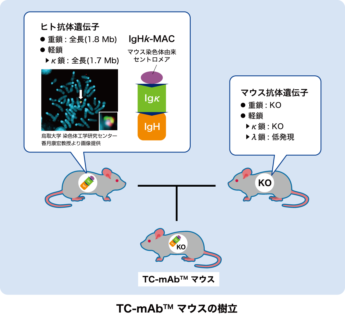 TC-mAb™マウスは、Trans Chromosomics社が抗体医薬の迅速な開発のためのツールとして開発したトランスクロモソミックマウス(人工染色体などの外来の染色体を導入することによって作製したマウス)です。独⾃の⼈⼯染⾊体ベクターを⽤いて、ヒト抗体遺伝⼦の可変領域と定常領域を完全⻑で導⼊しているため、ヒト由来の多様な抗体レパートリーを保有しています。TC-mAb™マウスを用いた抗体開発により、既存の治療薬と⽐較して同等以上のアフィニティを有するヒトモノクローナル抗体が複数得られております。