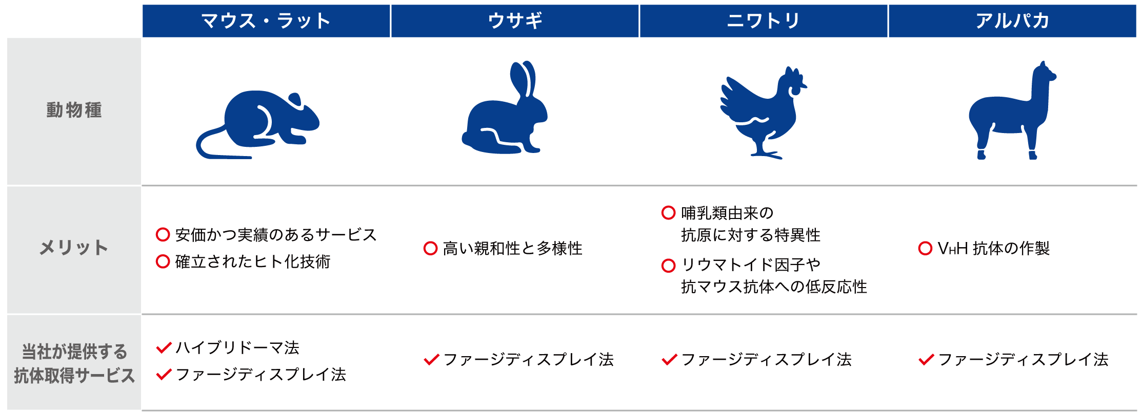当社では、マウス、ウサギ、ニワトリ、ヒトなどを中心に様々な動物種のモノクローナル抗体の作製実績がございます。その中でも、ラクダやアルパカなどから取得可能なVHH抗体は、IgG抗体と異なる様々な特徴から、以前より世界中の企業や研究施設で研究開発の対象となっております。近年、複数のVHH抗体が治療薬として上市されたことから、更なる注目を集めています。