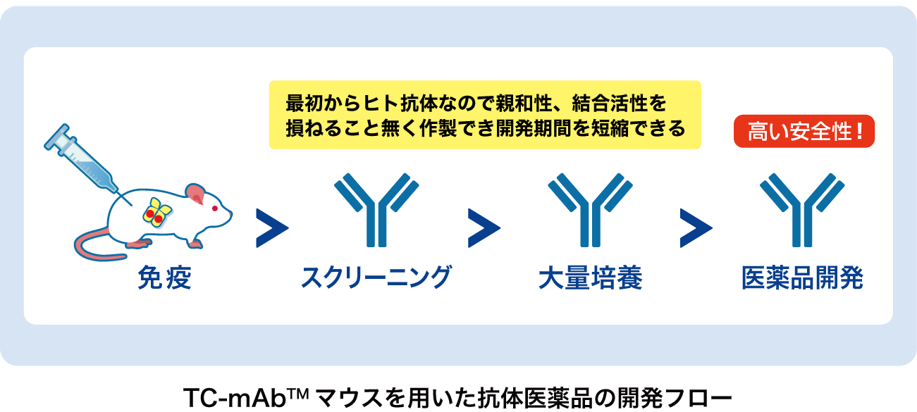 TC-mAb™マウスは、Trans Chromosomics社が抗体医薬の迅速な開発のためのツールとして開発したトランスクロモソミックマウス(人工染色体などの外来の染色体を導入することによって作製したマウス)です。独⾃の⼈⼯染⾊体ベクターを⽤いて、ヒト抗体遺伝⼦の可変領域と定常領域を完全⻑で導⼊しているため、ヒト由来の多様な抗体レパートリーを保有しています。TC-mAb™マウスを用いた抗体開発により、既存の治療薬と⽐較して同等以上のアフィニティを有するヒトモノクローナル抗体が複数得られております。